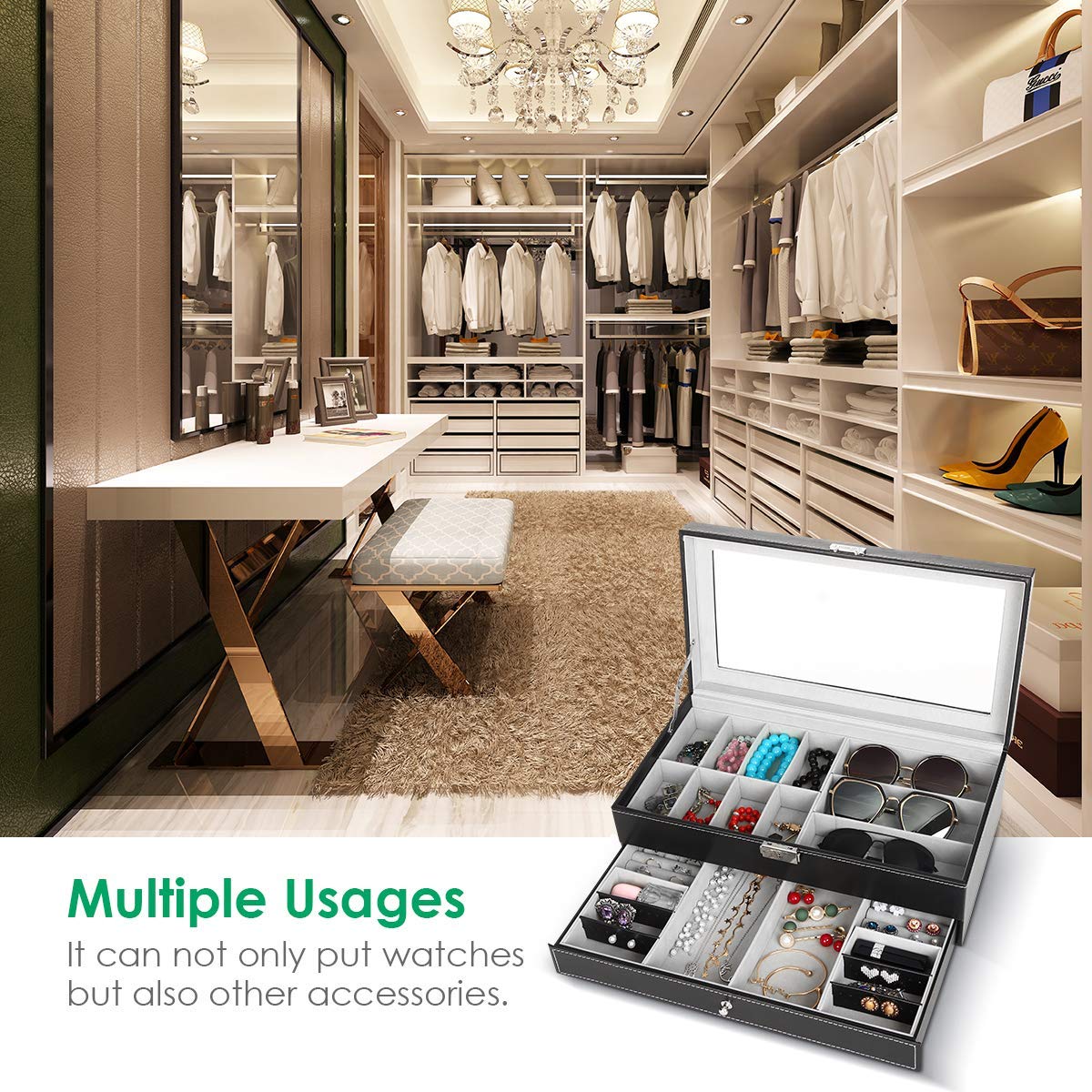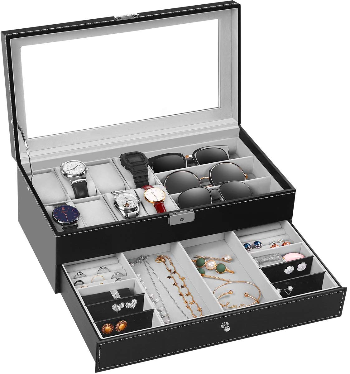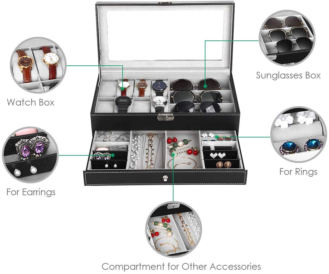 Double Layer Design: There are 8 watch slots with removable velvet pillows and 3 eyewear compartments in the top layer. And in second layer, it is a jewelry tray which includes 2 ring cases, 4 stud earring cards, 2 compartments for bracelets, necklaces, brooches, earrings, rings, and other jewelry. Our watch box has enough space to storage a lot of accessories.